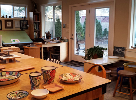 After retiring from a 34 year career teaching art in the Galesburg School District, Chris quickly started plans to build a new studio space mainly dedicated for clay work. Although stoneware clay for both functional and sculptural work is the main media Chris uses, she also works two dimensionally in painting, drawing and collage work.